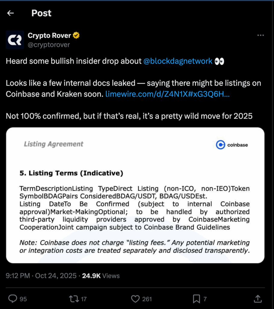 Crypto Rover’s leaked documents have lit up social media, suggesting BlockDAG is finalizing exchange listings with Coinbase and Kraken, two of the world’s most influential platforms. Unlike typical rumors, these leaks reportedly include specific figures and payment structures.